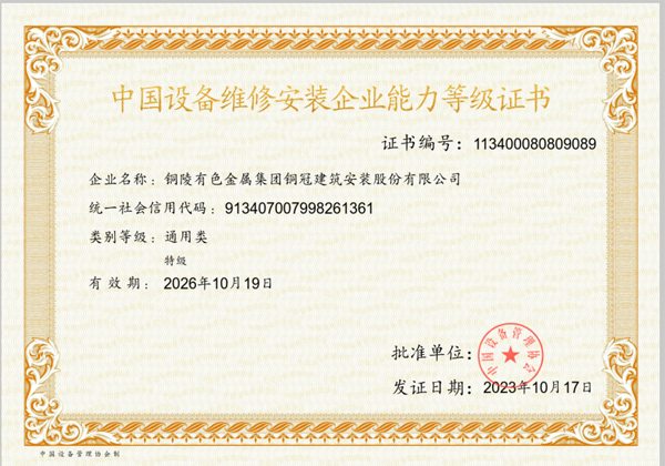 • 中國(guó)設(shè)備維修安裝企業(yè)能力等級(jí)證書