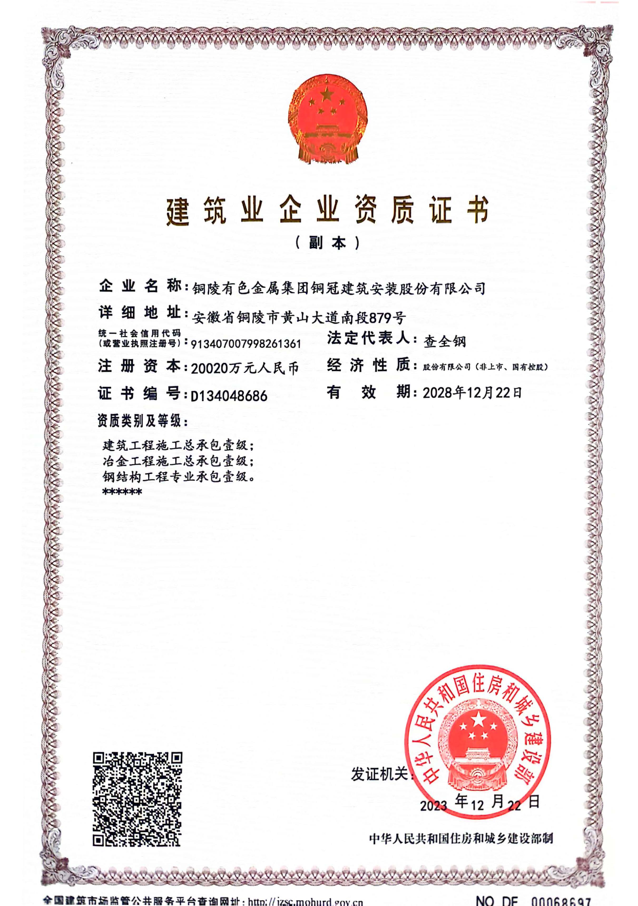 • 有色金屬工業(yè)建設(shè)工程質(zhì)量檢測(cè)機(jī)構(gòu)資質(zhì)證書